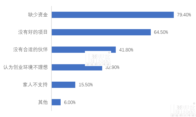 但是,創(chuàng)業(yè)不是一蹴而就的事情,如果失敗的話,最終所有的資金將付諸東流,阻止創(chuàng)業(yè)的原因有很多,有79.4%的人表示因?yàn)槿狈Y金而停止了創(chuàng)業(yè)的打算,64.5%表示因?yàn)槿狈玫捻?xiàng)目而停滯不前,有41.8%表示沒有合適的伙伴一起創(chuàng)業(yè),有32.9%認(rèn)為創(chuàng)業(yè)環(huán)境并不理想,還有15.5%的人受到了家里人的反對(duì)。想要?jiǎng)?chuàng)業(yè),真是困難重重!