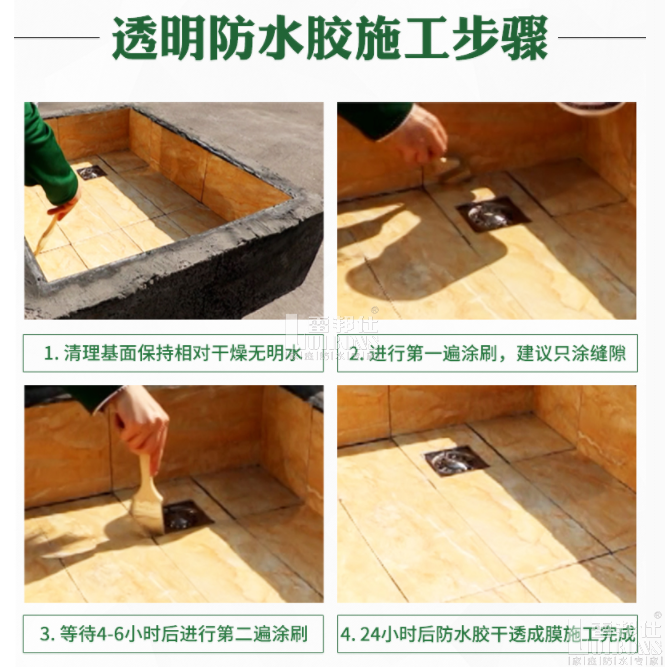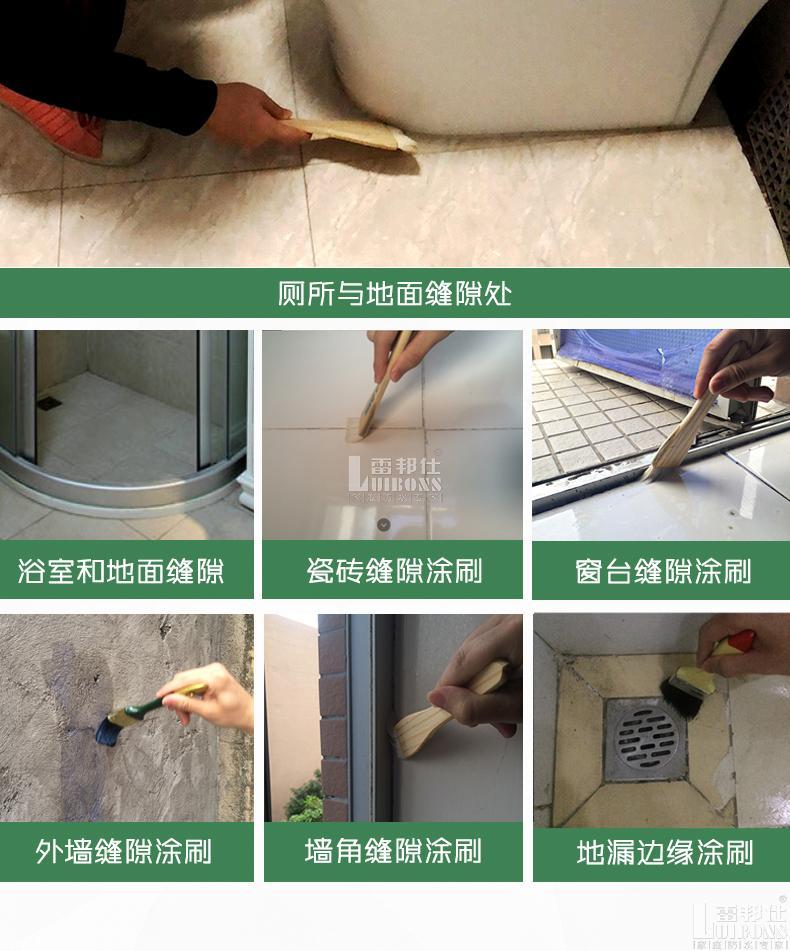 雷邦仕透明防水膠采用特種高分子聚合物為基料,經多種改性助劑研制而成的新型防水涂膜膠(透明), 該產品具有成膜性、柔韌、耐磨、透氣性和優異的耐候性。可直接涂刷于墻面瓷磚、石材、水泥混凝土等基層上,不起皮、粉化,防止水泥反堿,有效防止基材的滲水現象,使用壽命長,為增強墻面的耐久性提供了可靠的保障,屬水性環保產品。